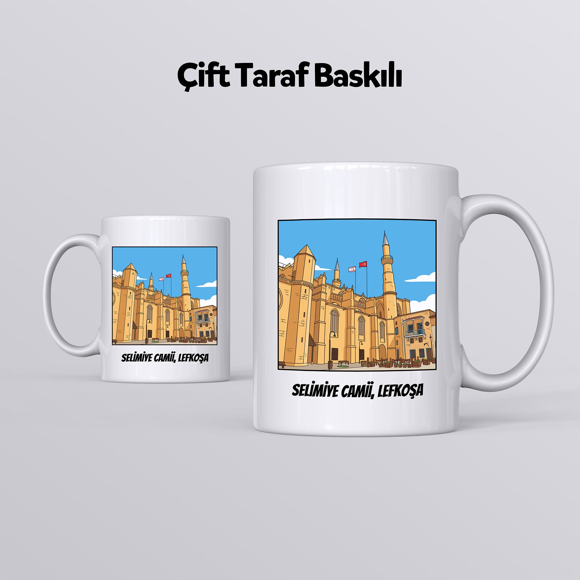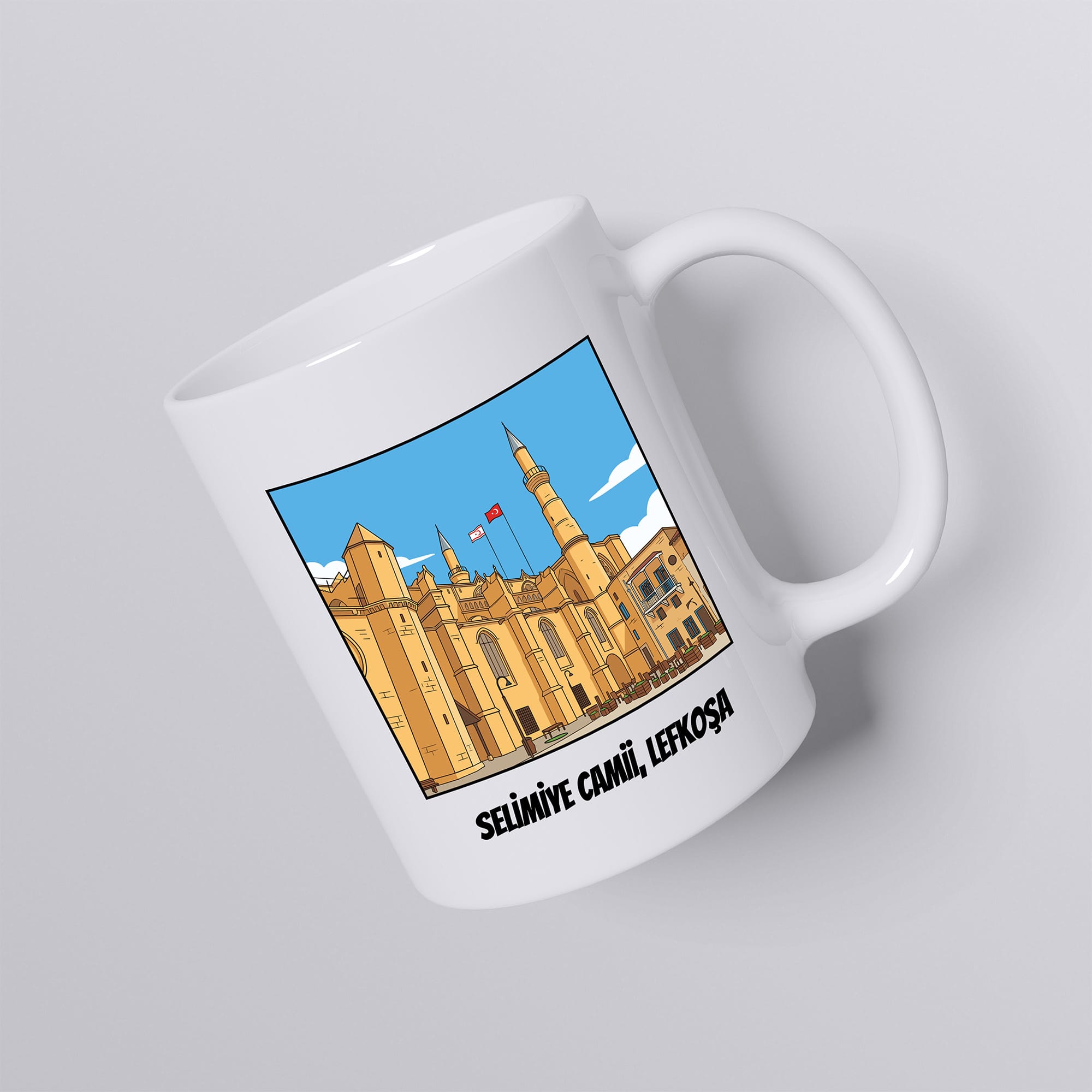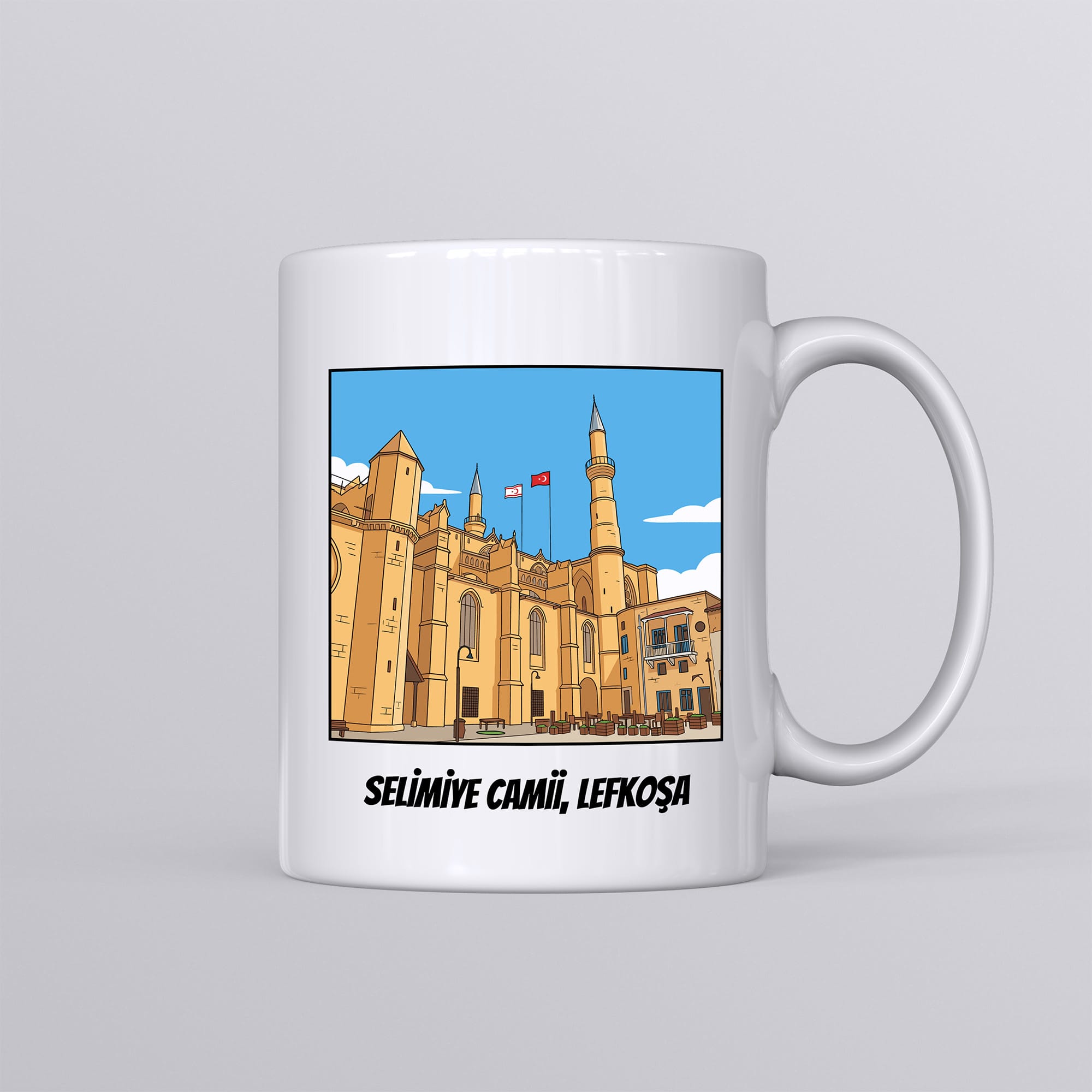 Bu zarif kupa, Lefkoşa’da yer alan Selimiye Camii’ni naif bir şekilde betimliyor. Silindir formundaki klasik seramik kupa bardak modelimiz, beyaz zemini sayesinde baskının detaylarını net ve canlı şekilde yansıtır. Sıcak ve soğuğa dayanıklıdır.